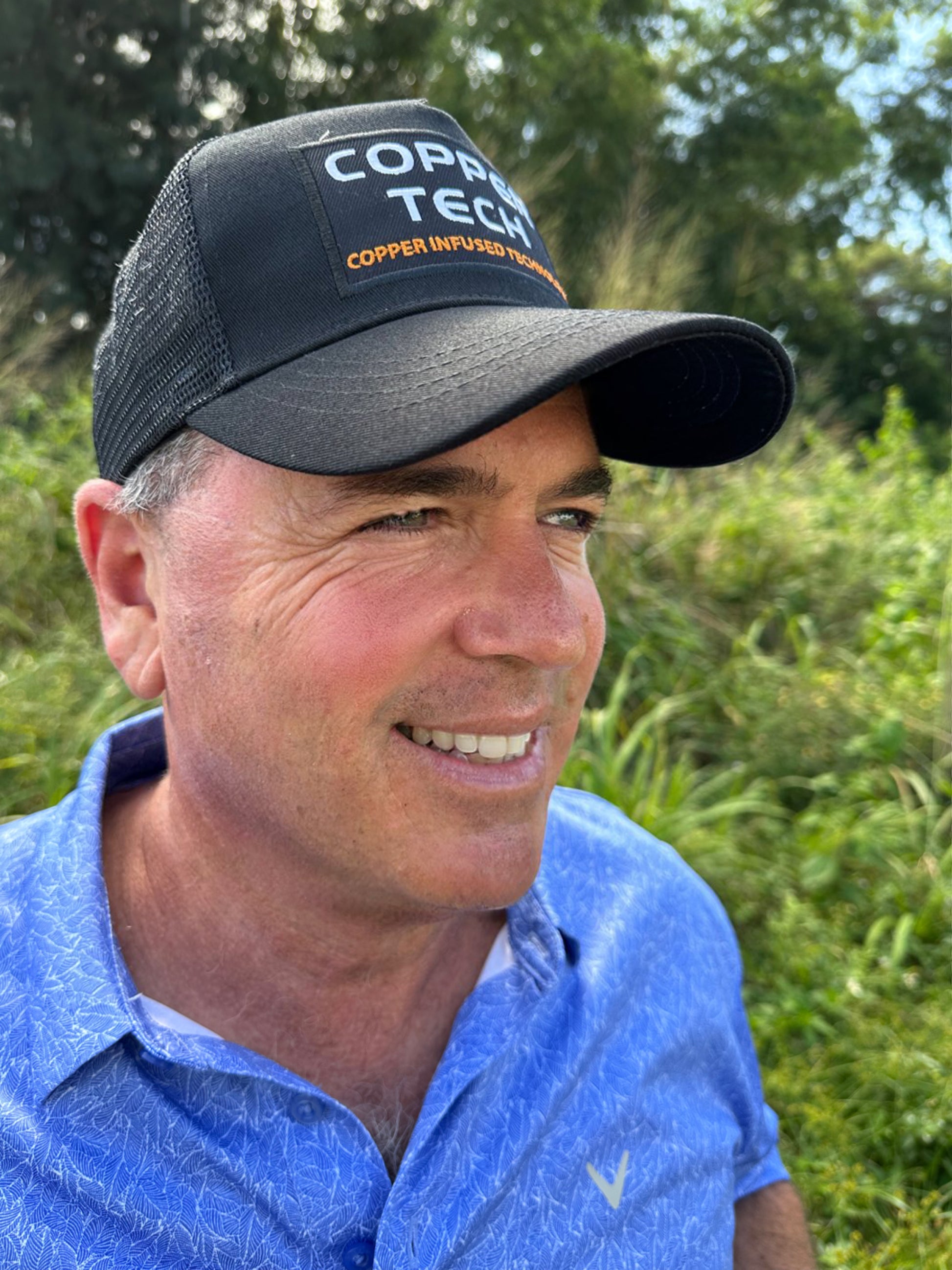 Introducing our newest product, our Copper Tech hats! This trucker-style snapback hat is designed for anyone doing any activity. Whether you're out on the golf course or enjoying your day out and about, the Copper Tech hat is the best option. With a breathable mesh back and adjustable sizing, this hat is for anyone. Designed by Lloyd's daughter, Lauren, to wear while she is bopping around town and on the golf course, he loved the idea of bringing them into production to share with our Copper Tech customers.
